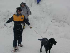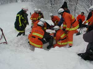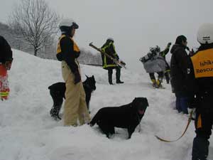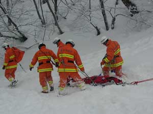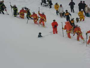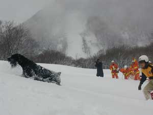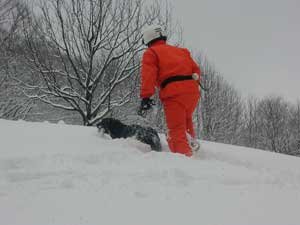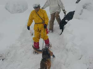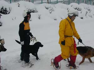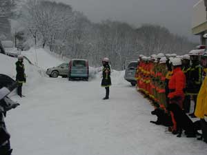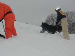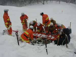 事故発生場所に到着後、関係者から状況を確認、1班は検索ラインから一列横隊で、検索棒(人力ゾンデ)により雪中の要救助者の検索をする。2班は災害救助犬により雑木林の検索を実施