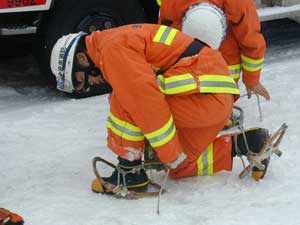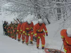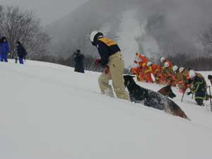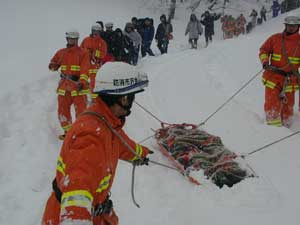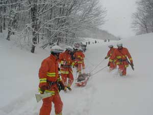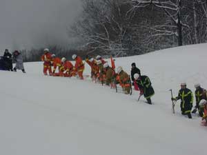 | 隊員はかんじきを着装、必要資機材を携行し、隊列を組んで事故発生場所まで移動する。 |