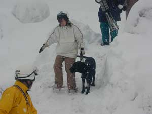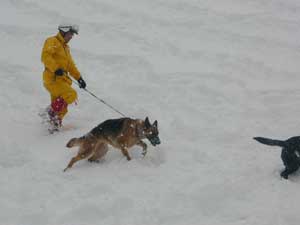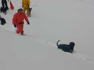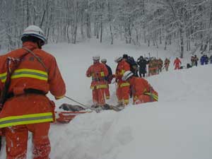 発見後、スコップおよび素手で掘り起こし、要救助者2名を救出する。