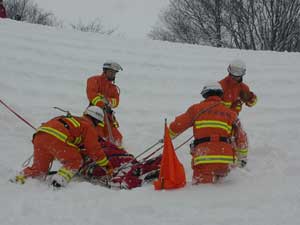 救出後、担架に収容し、出発位置まで搬送する。 |